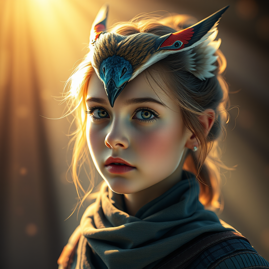 Alphonse Mucha and Guweiz influence intricate realistic Waxwing, vivid photorealistic portrait of young female, Bombycilla in ultra-detail, vibrant hues, dynamic light beams, Kerem Beyit style, compelling and emotion-filled portraiture, 8k quality, aspect ratio 5:7, with subtle creative twists and enhancements.