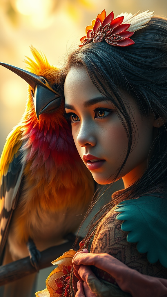 Alphonse Mucha and Guweiz inspire intricately detailed, realistic waxwing alongside a photorealistic young female, embodying Bombycilla-like features. Ultra-detailed with bright colors and volumetric light rays, infused with the emotive power of Kerem Beyit's portraiture, capturing a dynamic and expressive composition in 8k resolution, aspect ratio 5:7, blending elegance and intensity.