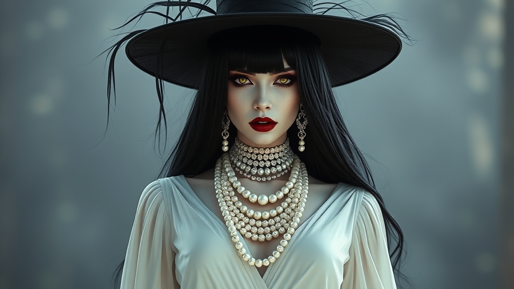 Alsina Dimitrescu towers at an imposing nine feet, exuding an aura of dark fantasy with her striking appearance. Her cascading black hair frames her pale white skin, contrasting vividly with her piercing yellow eyes and dark red lipstick. She dons an elegant, floor-length white flowing dress, enhanced by the drama of her large black wide-brimmed hat and the sophistication of black gloves. Adorning her neck are several layers of opulent pearl necklaces, adding regality to her presence. The atmosphere is steeped in Bathorycore aesthetic, evoking a haunting beauty reminiscent of Resident Evil, where Alsina reigns as an unforgettable villain.
