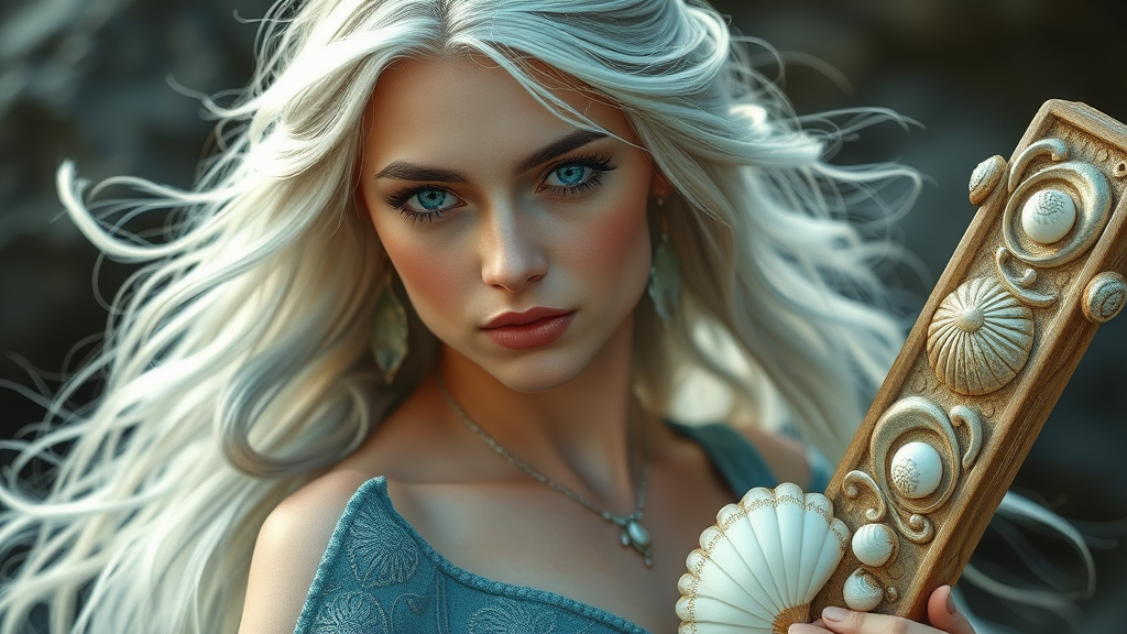 Althea, a compassionate and intuitive half-siren bard, enchants the hearts of her companions with her mesmerizing voice and melodies, inspiring bravery and healing the wounded. Her flowing silver hair cascades around her, and her captivating, sea-green eyes mirror the depths of the ocean. She carries a harp adorned with intricate seashell motifs, symbolizing her deep connection to the sea. Althea values empathy and understanding, tirelessly working towards bringing peace and harmony to the world. Her presence is a cinematic masterpiece, a dramatic testament to the power of music and compassion.