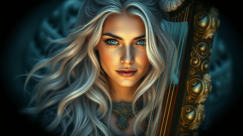 Althea, a compassionate and intuitive half-siren bard, enchants with her melodious voice, inspiring her companions and healing the wounded with her music. Her flowing silver hair and captivating sea-green eyes reflect her connection to the ocean. She carries a harp adorned with intricate seashell patterns, a symbol of her heritage. Althea values empathy and understanding, always striving to bring peace and harmony to those around her. The cinematic image captures her essence in a dramatic, centered composition, with a vignette enhancing her mystical aura. Her expression is gentle and serene, embodying her mission of harmony.