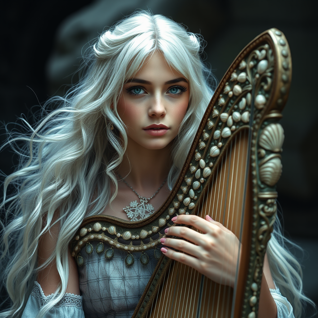 Althea is a compassionate and intuitive half-siren bard, whose enchanting voice and melodies inspire her companions and heal the wounded. She possesses flowing silver hair and mesmerizing sea-green eyes, complemented by a harp intricately adorned with seashell patterns. Althea values empathy and understanding, always striving to bring peace and harmony to her surroundings. Her presence is captured in a cinematic shot with a dramatic, centered composition, highlighting her ethereal essence as a masterpiece.