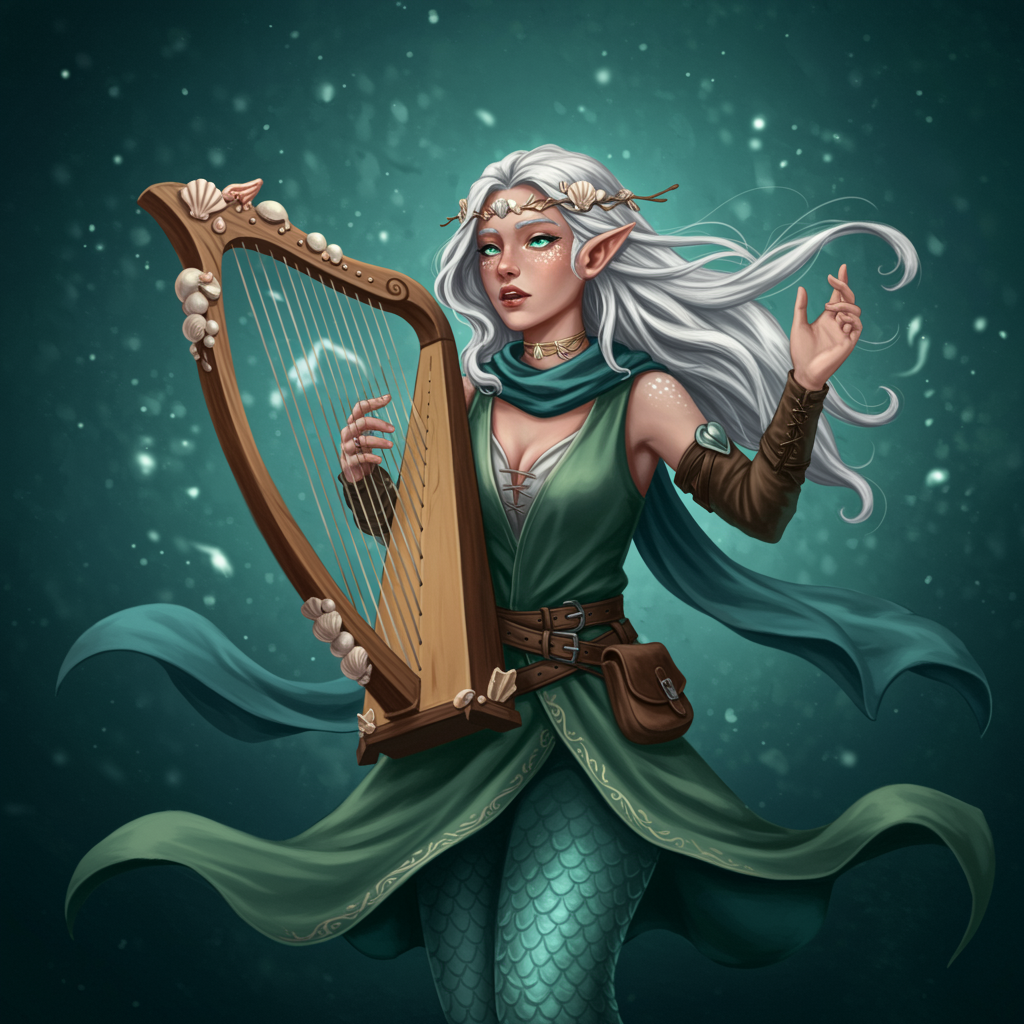 Althea is a compassionate and intuitive half-siren bard with a voice that enchants and heals. Her flowing silver hair and mesmerizing sea-green eyes accompany a harp adorned with delicate seashell designs. She inspires her companions, soothing the wounded with her melodies. Althea embodies empathy and understanding, striving tirelessly for peace and harmony. She moves gracefully, her presence a beacon of serenity in turbulent times. Her performances are ethereal, captivating all who hear her, and her mission is to bring unity to the world around her, one song at a time. Cinematic and dramatic, her aura is a masterpiece of divine inspiration.