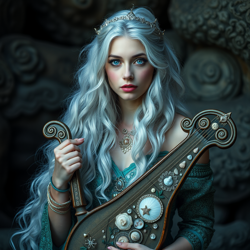 Althea is a nurturing and perceptive half-siren minstrel, whose mesmerizing voice and melodies uplift her allies and mend the wounded. With her cascading silver hair and entrancing sea-green eyes, she carries a lyre embellished with intricate seashell designs. She treasures empathy and insight, eternally seeking to bring peace and cohesion to her surroundings. Cinematic shot, centered, dramatic, masterpiece:1.