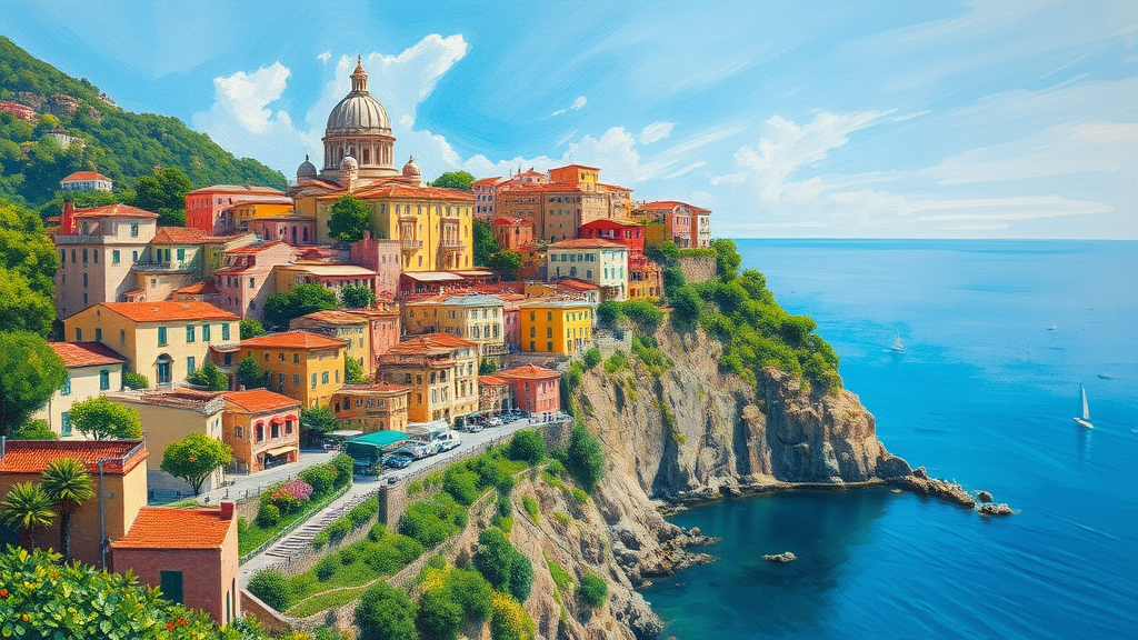 Amalfi coast in oil painting, inspired by impressionist style on a bright sunny day; vibrant buildings and domes perched above the azure sea, sailboats drifting in the distance; lush, green cliffs adorned with vivid foliage; rich, vibrant colors and intricate brushstrokes creating a textured canvas; captures an impressionistic essence, high resolution, aspect ratio 1:2, with a stylized touch at 750.