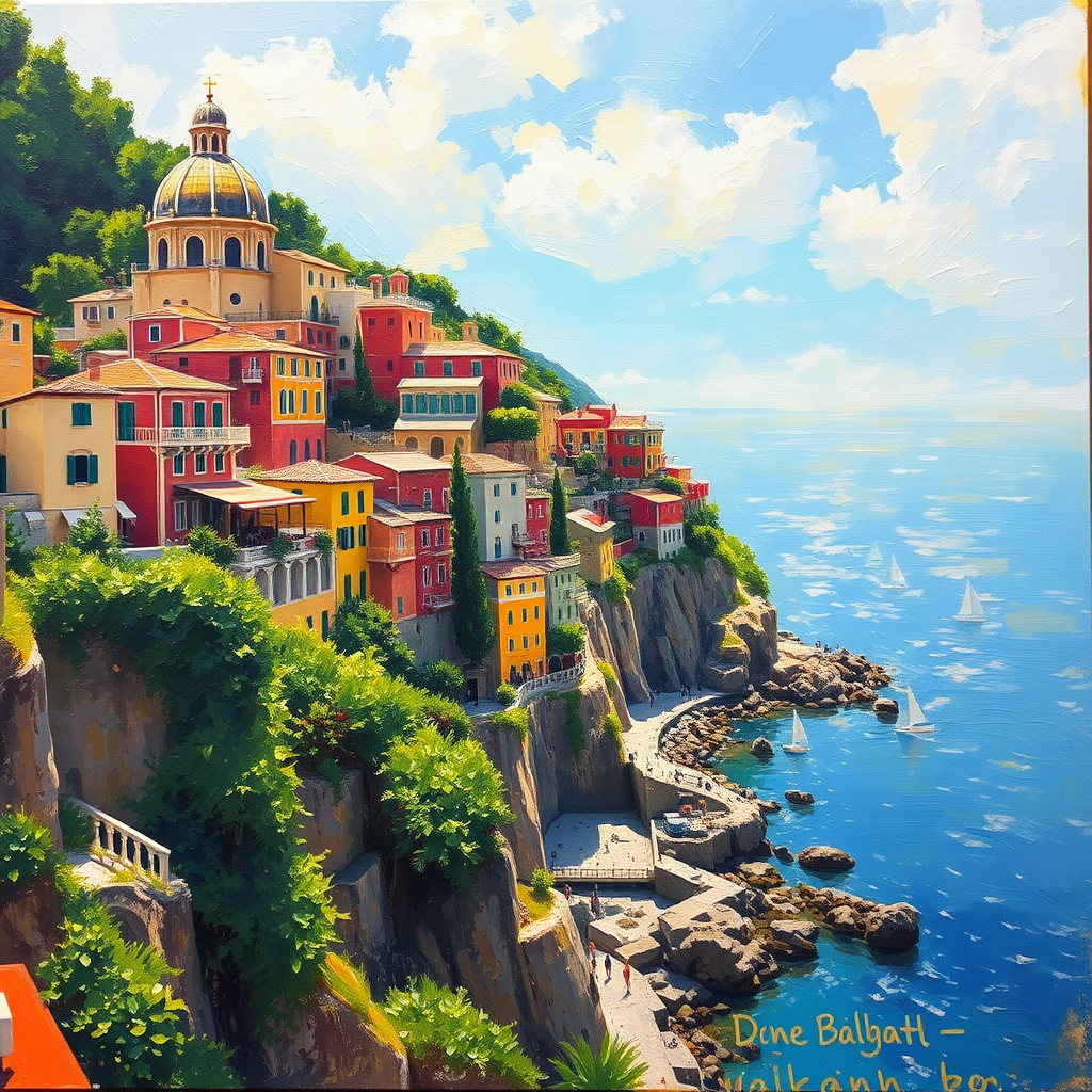 Amalfi coast scene in an oil painting with impressionist style, depicting a bright sunny day with a vibrant palette. Colorful buildings and ornate domes perch on cliffs overlooking the serene sea, dotted with sailboats in the distance. Lush greenery cascades down the cliffs, enhancing the lively atmosphere. The piece features intricate brushstrokes and a textured canvas effect, embodying the essence of impressionist techniques, presented in high resolution with a tall aspect ratio.