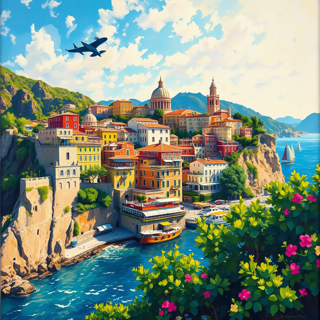 Amalfi coastline captured in an oil painting with an impressionistic twist, featuring a sunlit day with bright, vivid buildings and ornate domes perched above the shimmering sea, dotted with graceful sailboats in the distance. The cliffs are adorned with lush, verdant foliage. The scene is awash in vibrant hues, with intricate brushwork and a richly textured canvas effect. Crafted using impressionistic techniques, the painting offers a high-resolution view that embodies the lively essence of this picturesque locale.