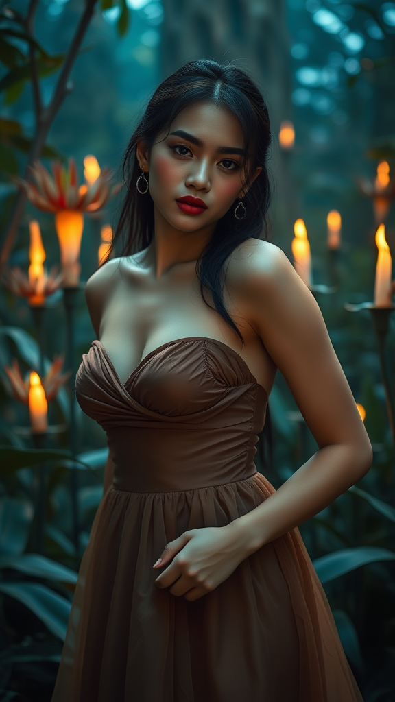 Amateur fashion photoshoot featuring an enchanting, big-chested Indonesian girl with a stunning face in a mystical, botanically alien dark garden. The scene captures her with a semi-open, voluptuous mouth, exuding excitement and passion in a captivating dress. Her poses are intriguing, showcasing highly detailed, photorealistic fabric. The photography is in a 35mm film style with an 8k HD quality, maintaining an aspect ratio of 3:2, with subtle creative flares and a dreamlike atmosphere.