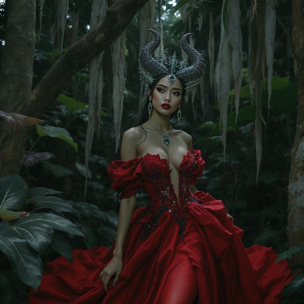 amateur fashion photoshoot in an enchanting botanical garden with a mystical alien theme, featuring a stunning Indonesian model with a captivating presence and beautiful features, subtle light flares accentuate her allure as she poses in an exciting, passionate dress, the intricate fabric rich in detail, her semi-open luscious lips enhancing her photogenic charisma. Flowing through the garden's dark, intriguing aura, the model strikes interesting and dynamic poses. The shoot embraces a classic photography feel, captured in photorealistic 35mm film quality, 8k resolution, maintaining an aspect ratio of 3:2 with an artistic verve and a sense of ethereal passion.