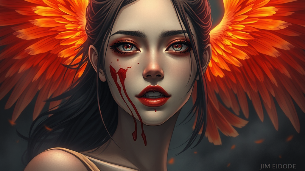 Amazing anatomy, best quality, 500px, cgsociety, portrait of a woman with blood on her face, living in a phoenix environment, profile picture, dark setting, mist, anime style, realistic. Model Jim EIDOMODE with enhanced features, ensuring clarity and artistic precision; full focus on the subject's face and surrounding, maintaining integrity with no additional distortions or poorly rendered elements.