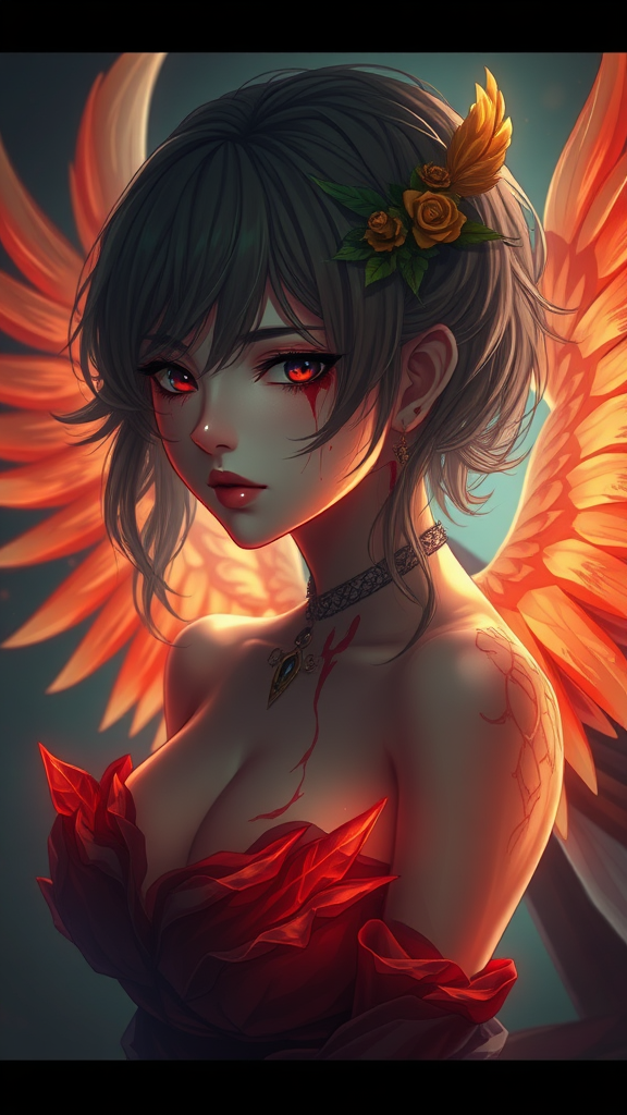 Amazing anatomy, high-quality, 500px, cgsociety, portrait of a character with blood on her face, residing in a phoenix-like environment, profile picture, dark setting, misty ambiance, anime style, realistic features, ethereal and mysterious elements, vibrant colors enhancing the mystical atmosphere, intense gaze, intricate details showcasing a fusion of elegance and haunting beauty amidst the shadowy, mythical surroundings.