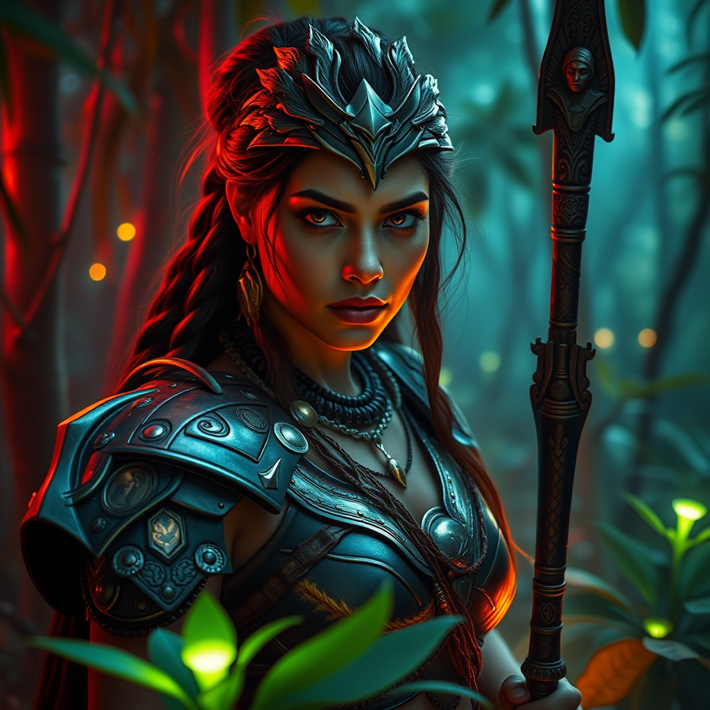Amazonian warrior in a mystical forest, vivid photorealism, intricate armor details, ethereal glow from bioluminescent plants, dynamic hdr lighting, cinematic proportions with striking features, 9:16 aspect ratio.