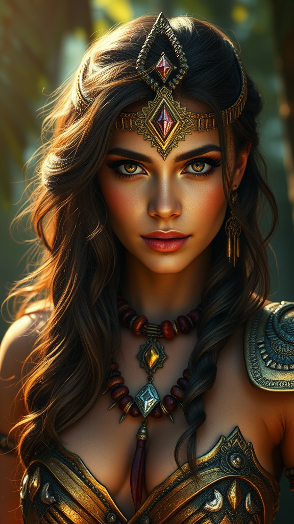 Amazonian warrior queen, hyper-realistic, exquisitely detailed, ethereal glow, vibrant colors, cinematic atmosphere, enchanting forest backdrop, dynamic composition, --ar 9:16