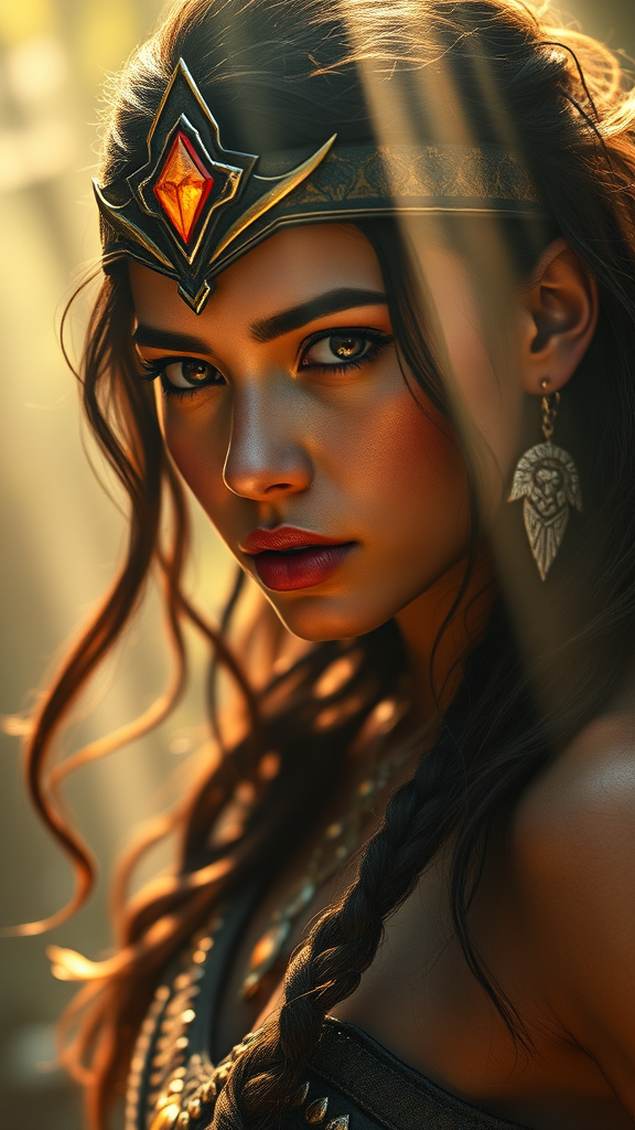 Amazonian warrior woman, incredibly detailed, enchanting fairy-like lighting, hyper-realistic, vibrant and bold colors, atmospheric beams of light, high dynamic range, cinematic aspect ratio 9:16.