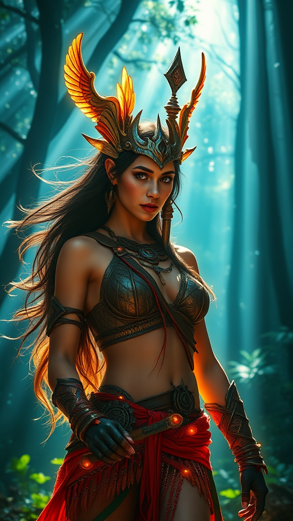 Amazonian warrior woman, intricately detailed, dreamy fairy lighting, hyper-realistic, vibrant colors, beams of volumetric light, high dynamic range, majestic forest backdrop, ethereal atmosphere, cinematic perspective.