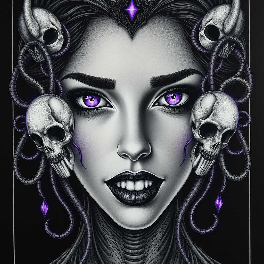 Amber Heard, ethereal face, flawless ultra-detailed eyes, captivating gaze, radiant glowing skin, impeccably detailed eyes, luminous, haunting teeth, skeletal motifs, malevolent aura, skulls and tendrils, shadowy atmosphere, monochrome palette, intricate linework, cinematic quality, surreal, black paper with vibrant amethyst accents, elaborate, symmetrical, tarot card style, highly detailed, ink illustration, influenced by Peter Mohrbacher, golden ratio principles, Lyriel v1.5 3D influences, artistic sketches, subtle creative variations while preserving core essence.
