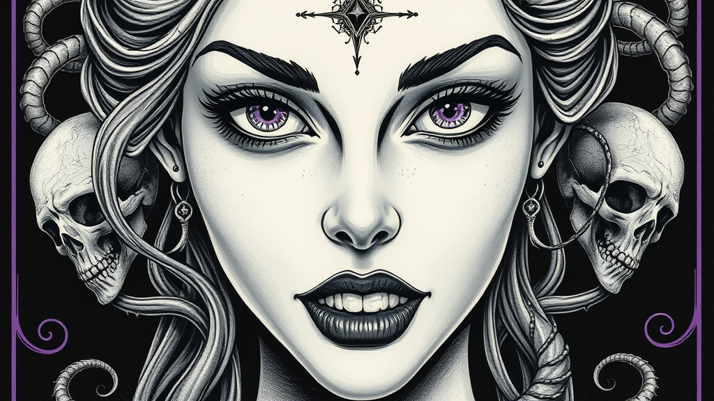 Amber Heard, hyper-detailed face, perfectly intricate eyes, seductive gaze, radiant skin, meticulously detailed eyes, eerie teeth, skeletal undertones, malice, skull motifs, swirling tendrils, dark and mysterious atmosphere, greyscale palette, elaborate linework, cinematic feel, psychedelic elements, black paper with striking amethyst outlines, ornate and symmetrical composition, tarot card aesthetic, exquisitely detailed ink illustration, inspired by Peter Mohrbacher, golden ratio harmony, Lyriel v1.5, enhanced 3D effect, cartoonish yet intricate, avoiding low resolution and normal quality, maintaining a mature and refined appearance.