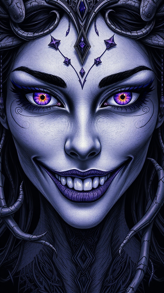 Amber Heard, intricately detailed face, exquisitely detailed eyes, alluring gaze, radiant skin, glowing eyes, unsettling smile, spectral teeth, ethereal, sinister undertone, skeletal elements, creeping tendrils, foreboding atmosphere, monochrome, elaborate linework, cinematic feel, surreal and vibrant, intricate amethyst detailing on dark canvas, ornate and symmetric, tarot-inspired, meticulously detailed pen illustration, reminiscent of Peter Mohrbacher’s style, harmonious proportions, Lyriel v1.5, minimalist 3D elements, artistic cartoon and anime influences, sketch-like quality, nuanced modifications while maintaining essence.