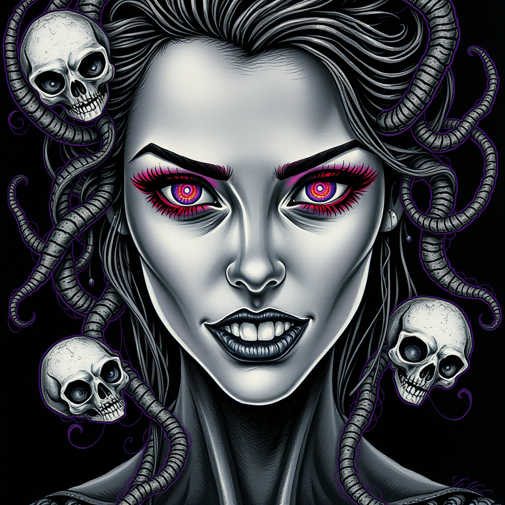 Amber Heard, intricately detailed face, perfectly captivating eyes, alluring gaze, radiant and lustrous skin, exceptionally detailed eyes, glowing aura, unsettling grin, skeletal elements, malice, skull motifs, tendrils weaving through a dark atmosphere, greyscale with vibrant contrasts, detailed linework, cinematic feel, psychedelic influence, black paper contrasted with vibrant amethyst outlines, ornate and symmetrical, tarot card aesthetic, highly detailed ink illustration, in the style of Peter Mohrbacher, adhering to the golden ratio, infused with subtle artistic variations to enhance uniqueness and depth while maintaining the foundational concept.