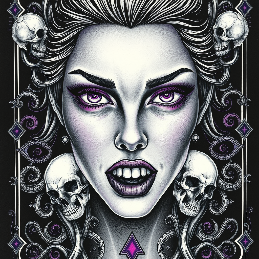 Amber Heard, intricately detailed face, perfectly crafted eyes with an intense gaze, radiant and lustrous skin, seductive expression, glowing presence, unsettling teeth, skeletal undertones, malevolent aura, skull motifs, swirling tendrils, ominous atmosphere, monochrome palette, intricate linework, cinematic influence, psychedelic flair, black paper with vibrant amethyst detailing, elaborate and symmetrical design, tarot card essence, exquisitely detailed ink drawing, style reminiscent of Peter Mohrbacher, infused with golden ratio elements.