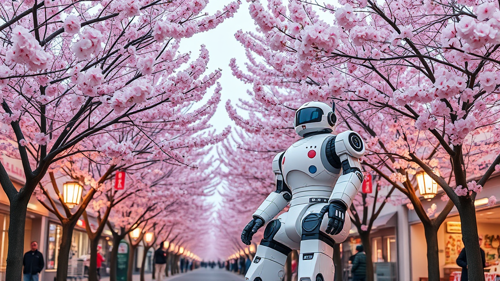 Amid the endless bloom of cherry blossom trees along Sakura Street in Japan, sits an enchanting Tachikoma robot, reminiscent of the iconic 'Ghost in the Shell' series, as captivating as a sakura in full bloom.