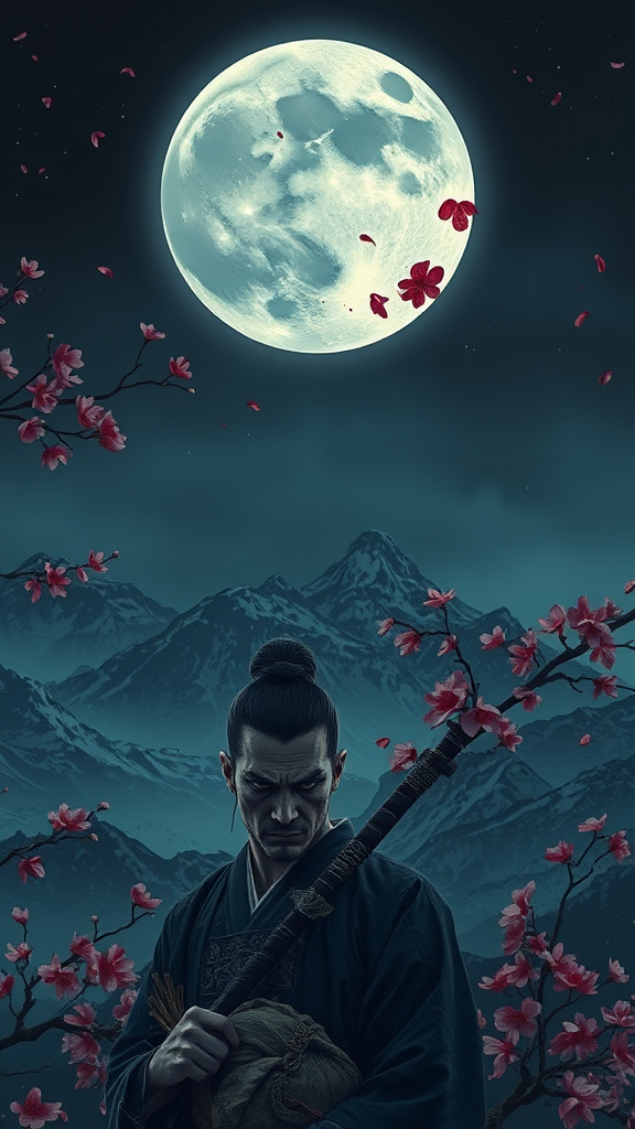 Amidst a blood-stained moon casting an eerie glow, a solitary ronin stands on a secluded Japanese mountain top, surrounded by delicate cherry blossoms swaying in the night breeze. His face is a tapestry of anger and sadness, reflecting a lifetime of battles and lost honor. Emotions swirl like the petals around him, painting a portrait of inner turmoil against the vast, echoing silence of the rugged peaks. The dim moonlight mingles with the crimson stains, creating a haunting dance of shadows and light, mirroring the ronin's conflicted soul.