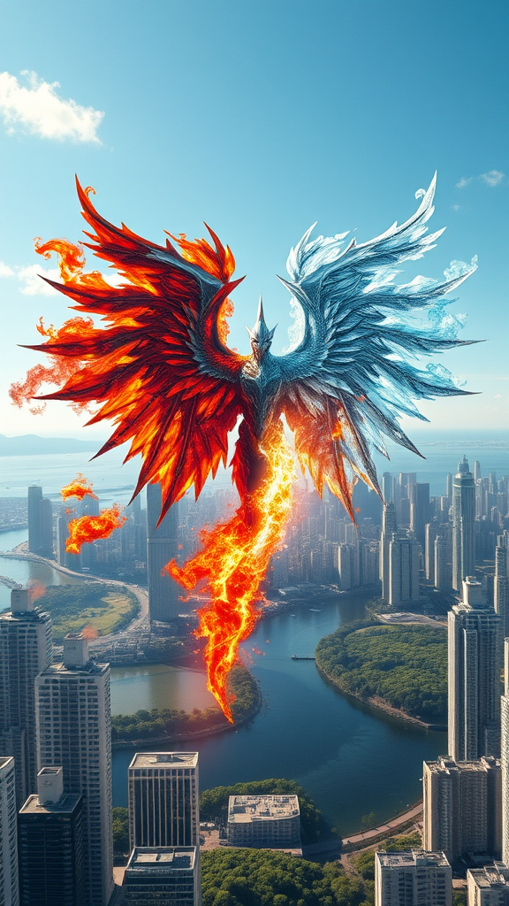 Amidst a city where chaos meets tranquility, an elemental sentinel stands resolute, a stoic guardian reflecting the dual forces of nature. With one side pulsating with vibrant flames, casting a warm glow, and the other enveloped in a shimmering ice armor, it embodies the delicate balance between destruction and preservation. Its imposing wings stretch wide, dividing the metropolis caught between a fiery blaze and an icy freeze. The sky is a serene expanse of blue, the sunlight illuminating the contrasts below. The calm oceans reflect the peaceful skies, while green landscapes flourish on the city's edge, melding untouched nature with the mundane rhythms of city life. Functional technology hums quietly amid the unaffected buildings, and ordinary wildlife thrives alongside colorful flora. This sentinel, an asymmetrical embodiment of fire and ice, stands as a testament to the harmonious coexistence of extremes, safeguarding both life and nature with unwavering grace.