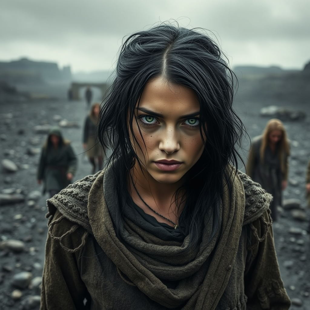 Amidst a desolate, grey wasteland reminiscent of a forgotten age, a woman with raven-black hair and piercing green eyes trudges through the bleak landscape. Her sunken eyes tell the tale of countless hardships endured. She is covered in dirt and clad in tattered rags, remnants of a harrowing escape from a shadowy dungeon. Around her, others in similar disarray wander aimlessly, their spirits scarred by the ordeals of captivity. Echoes of ancient times linger in the air, as if stories from Tolkien's Middle-earth have come alive, resonating with the whisper of Hillmen and Dunlendings. Amidst this somber backdrop, a grim determination burns within her, a flicker of hope against the desolation that threatens to consume them all.