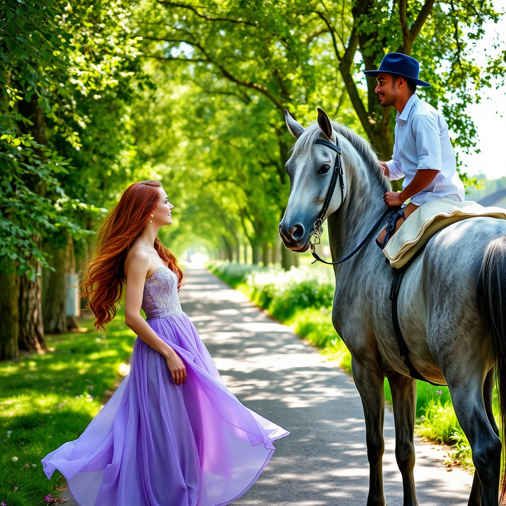 Amidst a peaceful tree-lined avenue, a young woman in a flowing lavender dress and a man atop a dappled gray horse share an intimate exchange. The woman, with her cascading auburn hair, stands gracefully on the left side of the frame, her eyes captivated by the elegant steed. Her lavender dress offers a striking contrast to the vibrant greenery encompassing the path. The man, seated to the right on his noble horse, returns her gaze with an expression of serene joy. He is dressed in a crisp white shirt and a navy-blue hat, his attire providing a vivid accent against the horse's muted gray coat. The horse, exuding majesty and calm, stands quietly, its presence harmonizing with the gentle scene. Behind them, a field of wildflowers enhances the picturesque setting, augmenting the tranquility of the moment. Sunlight filters softly through the leafy canopy, casting whimsical patterns on the path, imbuing the scene with an enchanting ambiance. The overall atmosphere is one of serene romance, capturing a moment of unspoken connection between the two amidst nature's beauty.