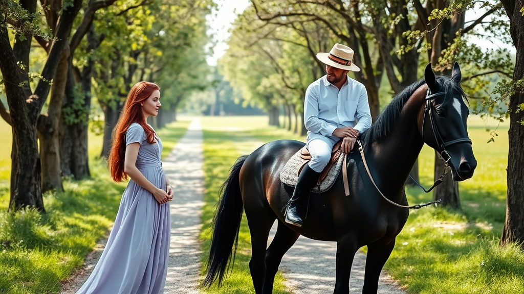 Amidst a peaceful tree-lined path, a young woman in a flowing lavender dress and a man atop a sleek black horse share a tender moment. The woman, her long auburn hair cascading down her back, stands to the left, her eyes locked onto the horse with a gentle curiosity. Her dress, a soft lavender hue, contrasts elegantly with the surrounding verdant landscape. To the right, the man sits comfortably on the horse, wearing a crisp white shirt and a straw hat that adds a dash of brightness against the rich tones of the horse's coat. The horse, a graceful creature with a shiny black coat, stands quietly on the path. Behind them stretches a lush meadow, enhancing the serene atmosphere of the scene. Soft, natural light filters through the foliage, casting playful shadows on the ground. The mood is tranquil and romantic, encapsulating a moment of genuine connection between the two individuals in this idyllic setting.