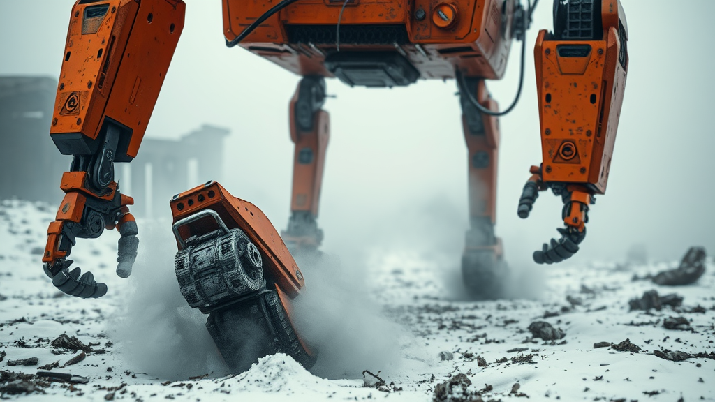 Amidst a post-apocalyptic landscape, an orange robot trudges through a snowy, fog-laden world, its vibrant hue a stark contrast against the monochrome backdrop. The scene unfolds through a series of close-up shots, capturing the intricate details of its weathered surface and the subtle whirring of its mechanical joints. Low angles emphasize its resilience and determination as it navigates through abandoned ruins and desolate terrains, the fog swirling around its metallic feet, shrouding the path ahead in mystery and echoing the solitude of its journey.
