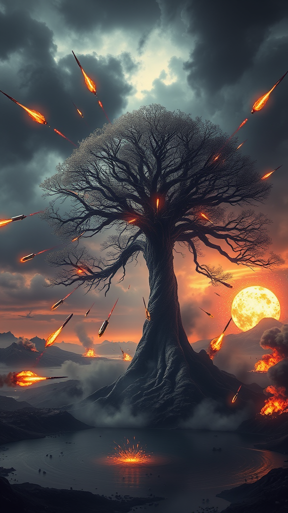 Amidst a surreal, apocalyptic war scenario, a colossal tree resembling a human kidney towers at the center, its branches weaving complex alveoli patterns, faintly glowing with fiery fissures. This majestic tree, representing life and fragility, stands resilient amid chaos as intense attacks unfold. Fiery meteor-like projectiles streak through a smoke-choked sky, leaving trails of embers and ash. Some projectiles soar mid-air, while others crash into the earth, triggering enormous explosions that hurl debris, smoke, and flames across the ravaged terrain. The lake below, once serene, now churns violently, with sections evaporating into mist from the heat and blast impacts. The war-torn landscape is dotted with scorched, blackened hills receding into the distance, while ominous smoke rises from impact craters surrounding the tree. Above, the sky is a tumultuous blend of deep gray clouds and vibrant fiery hues, with the faint orange glow of a dying sun fighting to penetrate the devastation. Brilliant flashes from the flaming spheres and explosions cast chaotic shadows, illuminating the battlefield with an intense, cinematic brilliance. The scene captures a sense of a desperate, climactic battle with destruction and the fragile symbol of life at its core, portrayed in hyper-realistic and cinematic detail, emphasizing dynamic movement, vivid colors, and intricate elements of fire, smoke, and the shattered world.