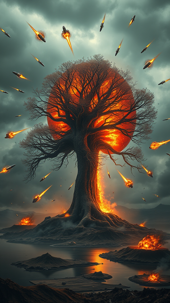 Amidst a surreal, apocalyptic war scene, a colossal tree shaped like a human kidney stands resilient at the center, its branches intricately resembling alveoli, shimmering faintly with fiery crimson cracks. This tree, a powerful symbol of life and fragility, endures an overwhelming siege amidst chaos. Fiery projectiles scream through the smoke-choked sky, their trails glowing with embers and ashes. Some fireballs soar mid-flight, while others have collided with the earth, detonating into massive eruptions of debris and flames that consume everything nearby. Below, a once-tranquil lake quakes violently, sections vaporizing into mist from the infernal heat and blasts. The war-ravaged terrain is littered with scorched, charred hills receding into the distance, tendrils of smoke rising menacingly, and craters marking the tree’s plight. The sky is a turbulent cauldron of dark, foreboding clouds blended with vivid reds and soft oranges from the dying light of the retreating sun, struggling to penetrate the veil of devastation. Intense flashes from the firestorms and explosions cast stark shadows, illuminating the scene with a dramatic, almost otherworldly brilliance. The picture conveys a dramatic battle reminiscent of the epic climax in a film, capturing chaos, ruin, and the tender emblem of life at the heart of the struggle. The depiction is hyper-realistic and cinematic, accentuating dynamic motion, vivid hues, and elaborate detail of fire, smoke, and the ravaged setting.