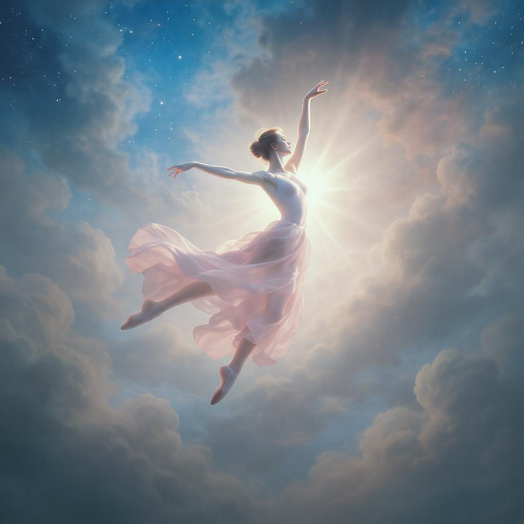 Amidst a surreal ballet of graceful motion, the celestial elegance is depicted in this portrait of a dancer suspended in midair. The gentle pastel hues, radiant backlighting, and billowing fabric conjure a dreamlike atmosphere. The scene showcases dramatic lighting and is rendered in ultra-high resolution with a 9:16 aspect ratio, enhancing the ethereal experience.