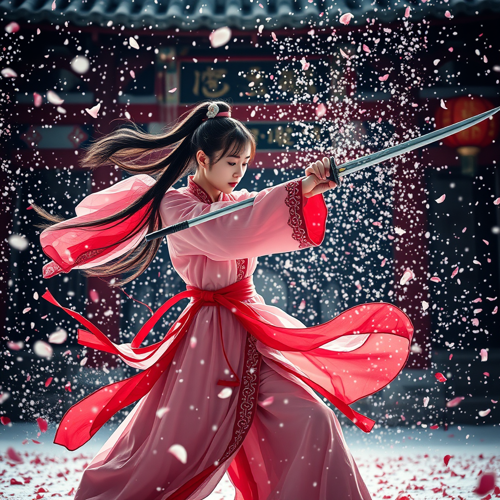 Amidst a swirling blizzard of snow and delicate petals, a 16-year-old Chinese girl gracefully brandishes a sword, her Hanfu robes flowing with every movement. In the heart of an ancient temple, she stands her ground, engaging in a fierce martial arts duel. The Chinese fairy tale backdrop comes alive with vibrant bursts of color, enhancing the cinematic atmosphere. With stunning realism and dynamic motion, the dramatic scene is illuminated by expertly crafted lighting and shadows, capturing the intensity and elegance of her every strike. Shot on a 35mm lens, this breathtaking visual captures the beauty and power of her sword-fighting prowess against a mesmerizing tapestry of light.
