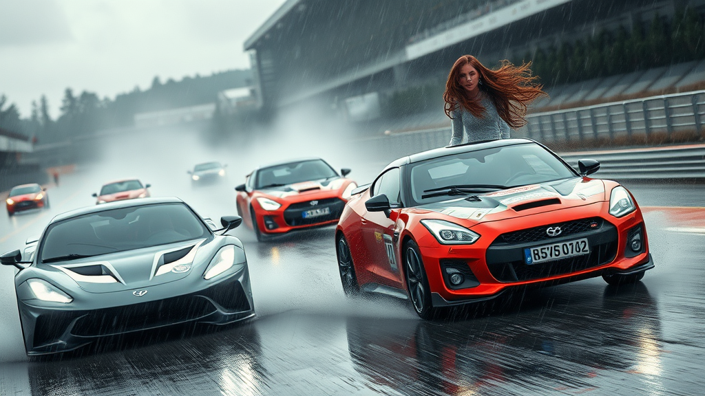 Amidst a torrential downpour, sleek racing cars like the Swift zoom around a slick racetrack, their engines roaring and tires spraying water in dramatic arcs, as a determined young woman stands resolutely in the background, her rain-soaked hair whipping in the wind, capturing the intense energy and chaos of the stormy spectacle.