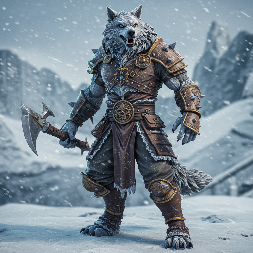 Amidst a vast snowy expanse stands a formidable wolf warrior, its anthropomorphic form exuding strength and confidence. This fantasy figure, inspired by D&D lore, boasts an intricate blend of wild ferocity and noble bearing. Captured in a product shot, the scene embodies masterful realism with hyper-detailed features accentuated by cinematic lighting. Frost clings to its fur, and each muscle and claw is meticulously rendered, creating a spectacle of both beauty and power in 32k UHD resolution.