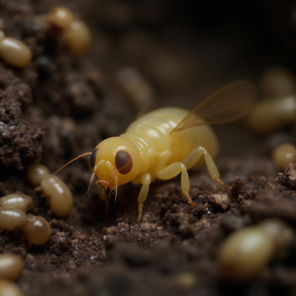 Amidst the dim, earthy tones of a bustling termite colony, a unique parasitic creature makes its stealthy approach. This rare fly larva, with a translucent, buttery yellow body, disguises itself to resemble the very termites it seeks to infiltrate. Its head is a glossy, bulbous replica of a termite's, complete with minuscule dark eye spots and delicate, threadlike antennae that sway gently as it moves. Crawling seamlessly on the textured, coffee-brown soil, the segmented larva uses its deceitful appearance to blend perfectly into the industrious swarm. In this highly detailed scene, akin to macro photography, each facet of the larva's anatomy is emphasized—from its tiny, articulated legs to the cunning structure of its termite-like head—across a backdrop that blurs into the remnants of subterranean life. The larva’s mimicry is accentuated by the shallow depth of field, capturing its evolutionary mastery in this hidden underground world.