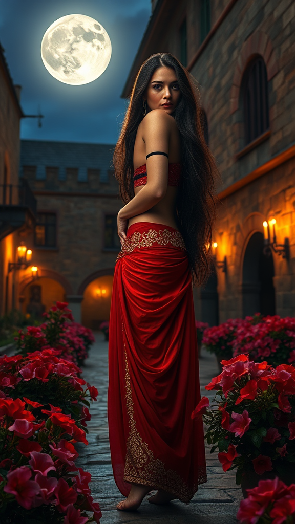 Amidst the medieval castle courtyard at dusk, the enchanting rays of a radiant full moon intertwine with flickering torchlight and the warm glow of candlelight, casting a magical aura over a captivating beauty. Her red and gold belly dancer's attire shimmers in the luminescence, as the moonlight gently caresses her form, highlighting her graceful pose. Barefoot, she stands amid a sea of vibrant blossoms, her gaze mesmerizing and full of allure. An elegant black band elegantly graces her neck, adding an air of mystery. Her luscious, hip-length raven hair cascades down her back like a dark waterfall. With her back turned to the camera, she glances coyly over her shoulder, drawing the viewer in with a silent invitation. Captured with a Leica M10 and Helios-44 58mm f/2 lens, stopped down to f/2.8, this fine art color photograph radiates deep, rich tones and exquisite highlights. The soft, diffused light filters through her flowing hair, accentuating the delicate curves of her silhouette, while the midday sun enhances her luminous expression.