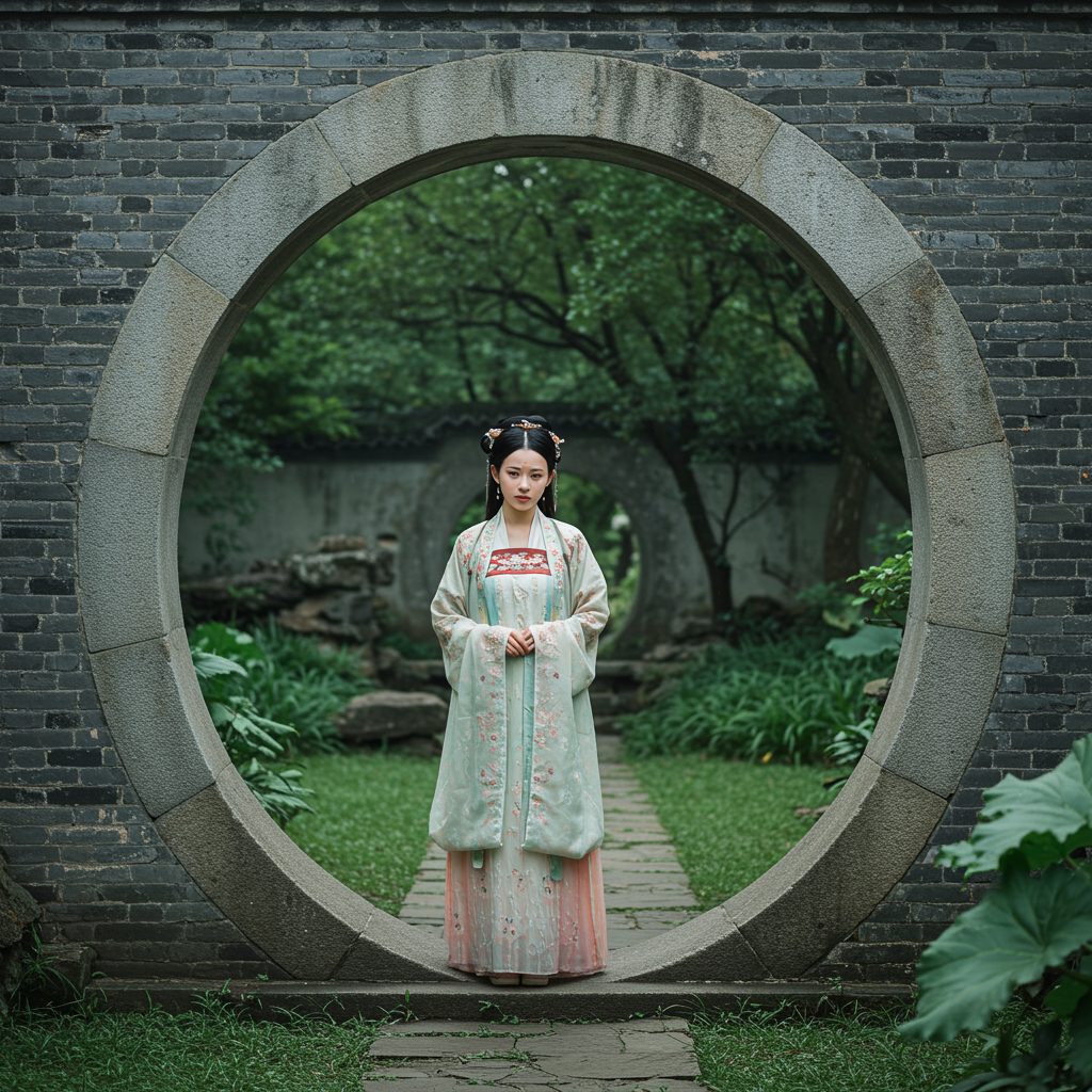 Amidst the peaceful setting of a stone archway, a young woman stands as the centerpiece of this scene. She is dressed in a traditional Chinese gown, adorned with intricate floral designs and flowing long sleeves. The dress's vibrant hues stand in striking contrast with the subdued tones of her environment. Her expression, deep in thought, lends an enigmatic quality to her presence. The archway frames her perfectly, guiding the viewer's focus directly to her. The weathered texture of the stone archway adds an old-world charm to the setting, with its muted grays elegantly complementing the lush greenery that surrounds her. In the background, a serene garden unfolds, brimming with rich vegetation and towering trees. The garden's abundant greenery creates a soothing and peaceful atmosphere, enhancing the scene's overall calmness. The lighting in this image is gentle and diffused, casting soft shadows and highlighting the stone archway's textures and the woman's garment. This lighting creates a warm and welcoming ambiance, further accentuated by a subtle color grading that bathes the scene in a gentle pastel glow.