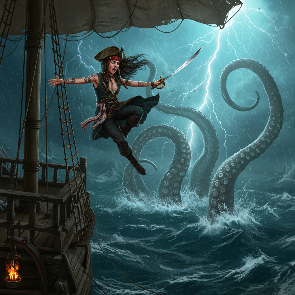 Amidst the raging Caribbean storm, a stunning yet fierce female Caribbean pirate captain with intricate tattoos, clad in attire reminiscent of Jack Sparrow, balances atop the precariously swaying mast of a captured Spanish galleon. Her intense dark eyes burn with determination as she launches herself into the tumultuous air, both hands gripping the hilt of her sword, aiming it towards the colossal Kraken below. The menacing sea monster, a mass of undulating tentacles, rises ominously from the ocean depths, its wrath targeting her ship. Undaunted, the captain utters a triumphant battle cry, descending in a graceful, horizontal pose, her blade poised to pierce the heart of the ancient leviathan. As lightning illuminates the scene, she becomes a vortex of fury and steel, diving from the towering mast onto the Kraken’s monstrous form. The image captures a hyper-realistic, highly detailed moment of courage and chaos.