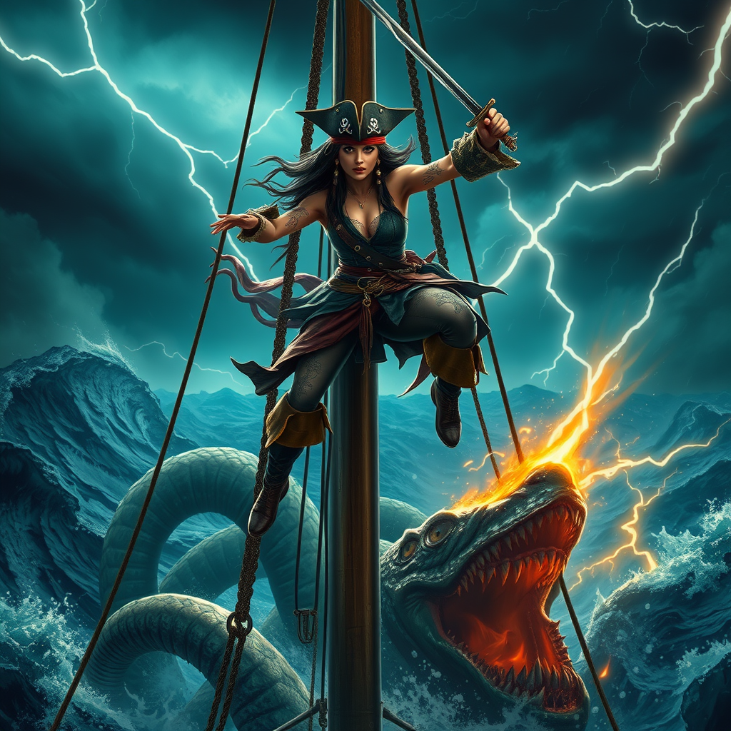 Amidst the roaring chaos of the Caribbean sea, a captivating yet fierce Caribbean pirate captain, adorned with intricate tattoos and dressed in a style reminiscent of Jack Sparrow, balances atop the swaying mast of a formidable Spanish pirate ship. Her piercing dark eyes burn with unwavering resolve as she springs into the storm-laden air, grasping her saber with both hands, ready to strike. Below, the monstrous Kraken—a serpentine mass of writhing tentacles—emerges menacingly from the abyss, its vicious intent fixed on her vessel. Undaunted, she releases a thunderous battle cry, poised in mid-air, her form parallel to the horizon, saber aimed to pierce the ancient beast's head. Illuminated by the fierce flashes of lightning, she charges from the towering mast into a tempest of fury and steel, a perfect blend of daring and skill.