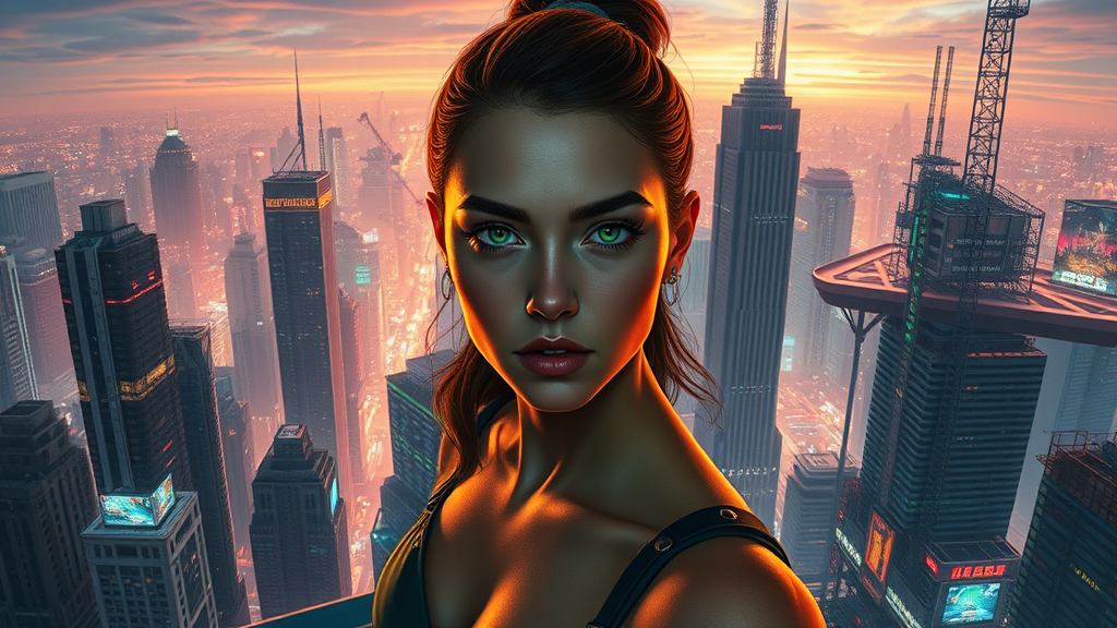 Amidst the towering skyscrapers of a dystopian cityscape, a fearless young woman stands at the precipice of a gleaming, neon-ventilated platform, her piercing emerald eyes burning with an inner fire as they gaze out upon the sprawling metropolis. Hyper-realistic lines and curves define her angular features, from the sharp jawline to the sleek, high-cheekboned visage. surrounding grungy textures of corroded steel and overlapping, mesmerizing neon reflections create an immersive, densely layered visual landscape that defies the boundaries of space and time. The air is alive with the hum of holographic advertisements and the distant thrum of hovercars as the sky shimmers with a perpetual, electric twilight, drawing the viewer into a world where innovation and decay coexist in perpetual, frenetic dance.