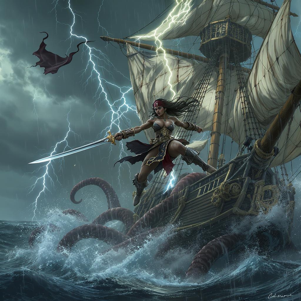 Amidst the turbulent Caribbean sea, a stunning yet fierce and resolute female pirate captain of Caribbean descent, adorned with intricate tattoos and dressed in a dashing outfit akin to Jack Sparrow's, stands poised atop the swaying mast of a majestic Spanish galleon. Her piercing dark eyes burn with determination as she propels herself into the salty air, gripping her saber with both hands. Below, the monstrous Kraken—a formidable mass of thrashing tentacles—emerges from the ocean's depths, its malevolent intentions fixed squarely on her ship. Undaunted, she releases a fierce battle cry as she descends in a powerful horizontal pose, prepared to drive her gleaming blade deep into the Kraken's ancient form. As lightning illuminates the scene, she flies from the lofty mast directly onto the creature—a whirlwind of fury and steel.