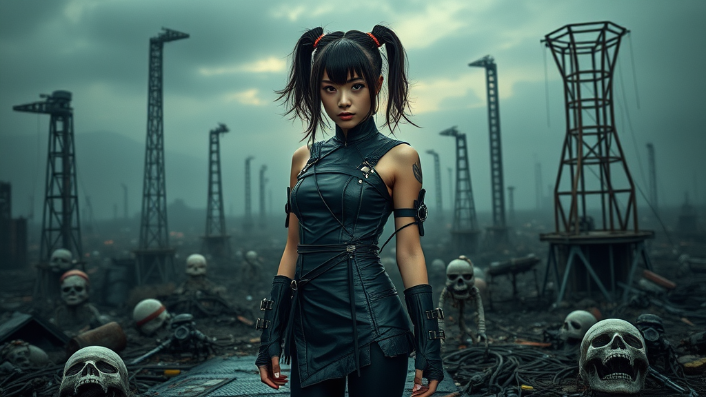 An 18-year-old Japanese girl exuding a gorgeously edgy vibe stands amidst a dystopian landscape. She dons a fusion outfit that blends cyberpunk, punk, and emo styles, featuring a sleek, modern qipao paired with black leggings. Her piercing gaze meets the viewer, hinting at both vulnerability and strength. The apocalyptic backdrop enhances her dangerous allure, with high detail capturing the intricate designs of her attire and the gritty, chaotic world surrounding her.