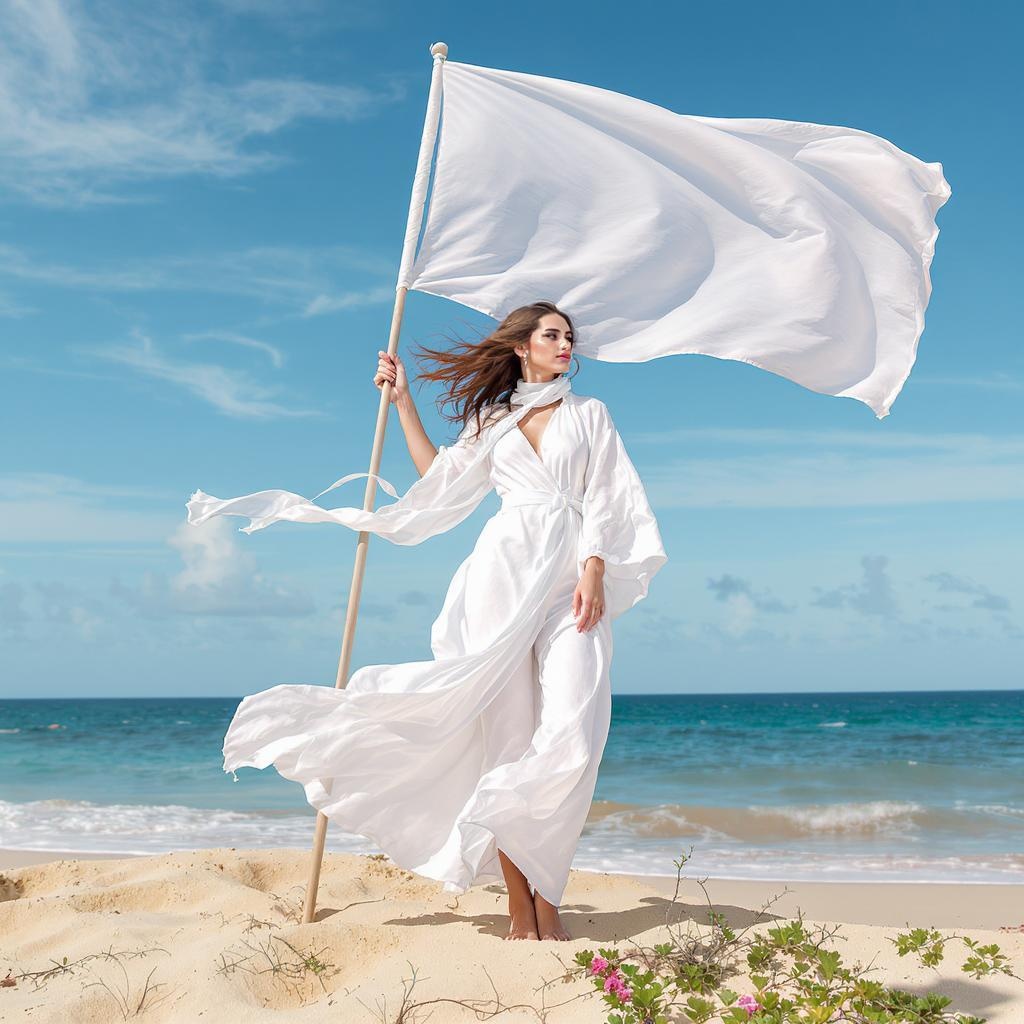 An 18-year-old Slavic model stands majestically atop a sandy beach, exuding the essence of a modern-day muse. Wearing flowing white robes that dance in the wind, her Slavic features are highlighted against the backdrop of open skies. Her hair cascades freely, caught in a gentle breeze, as she holds a white flag that flutters with purpose. The scene evokes the creative spirit of Issey Miyake. In a Cuban setting, the air is charged with euphoria, as if infused with palpable mana. A promotional shot captures the hyper-feminine energy, further accentuated by a delicate white scarf that adds elegance and grace.