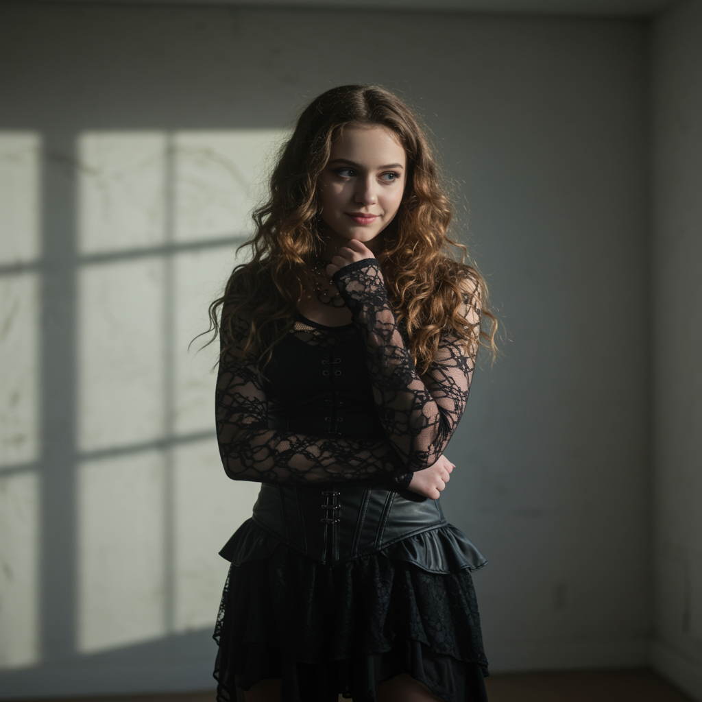 An 18-year-old with wavy hair stands in a completely open room, soft light streaming in from both sides, casting gentle shadows. A shy smile graces her face as she wears edgy, avant-garde attire that hints at BDSM elements, blending leather and lace with a touch of elegance. Her gaze is contemplative, lost in thought as she surveys the room. The scene is captured with a cinematic lens, amplifying the play of light and texture, highlighting her enigmatic presence.