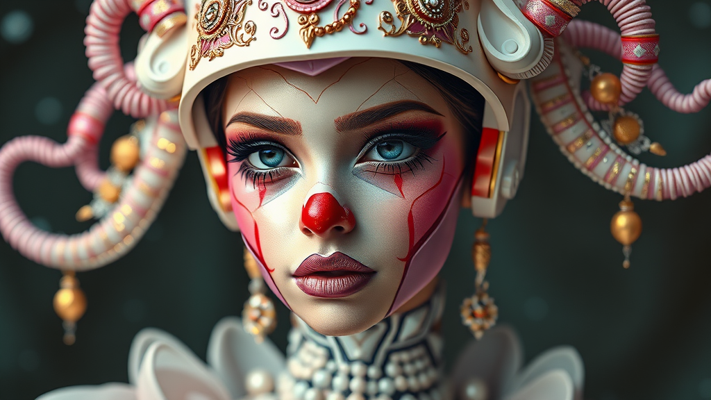 An 8k photo of a stunning galactic prima ballerina with a whimsical clowncore aesthetic, this Russian cyborg college girl embodies a blend of elegance and futuristic charm. Her features follow the golden ratio, exuding a sci-fi fantasy allure with intricate details. The digital painting captures a decadent and highly detailed design, reminiscent of a fairy tale, infused with cyberpunk elements. The artwork showcases smooth, sharp focus and reflects the styles of renowned artists like Artgerm, Loish, and WLOP. This captivating portrait draws inspiration from Ever After High, rendered in high-octane quality, and fits perfectly on ArtStation. The composition is a vibrant concept art piece that blurs the lines between illustration and reality.