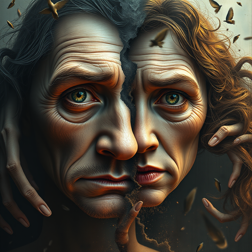 An 8k ultra quality photorealistic masterpiece illustration captures two intricately detailed faces, merged seamlessly into one, their eyes reflecting endless memories emerging from obscurity. Each face, a tapestry of vivid life experiences, holds sharp, intricate details, with dramatic lighting reminiscent of a finely rendered oil painting. The background, an abstract swirl of memories and emotions, portrays some fading into dust, particles adrift in an ethereal breeze. The composition pushes the boundaries of realism, as twisted limbs and aberrant forms twist and merge, creating an almost surreal landscape of human form—extra limbs and fingers emerging from nowhere, presenting a chaotic dance of life and shape. The faces, trapped between plastic reality and distorted memories, captivate with their expressive eyes and complex expressions. The piece brims with visual tension, a collision of hyper-realistic detail and artistic abstraction, leaving viewers pondering the fine line between reality and memory, while maintaining a haunting beauty despite the dissonance of malformed features and extraneous elements.