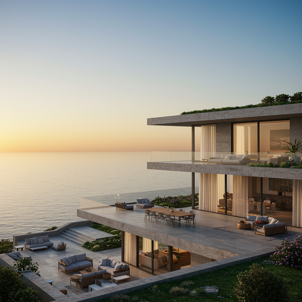 An 8K ultra-realistic image of a stunning house with sleek concrete edges and expansive glass walls embodying a 21st-century modern aesthetic, bathed in the warm glow of golden hour. The property overlooks a vast, tranquil sea, its surface shimmering softly in the gentle evening light. The house features a rooftop garden with hints of greenery adding a touch of nature to the modern design. Scattered around the patio are chic outdoor furnishings, their clean lines mirroring the house's architectural style. The horizon stretches infinitely, blending the serene seascape with the vibrant sky, as the sun dips just above the water's edge, casting long shadows and highlighting the exquisite details of the house.